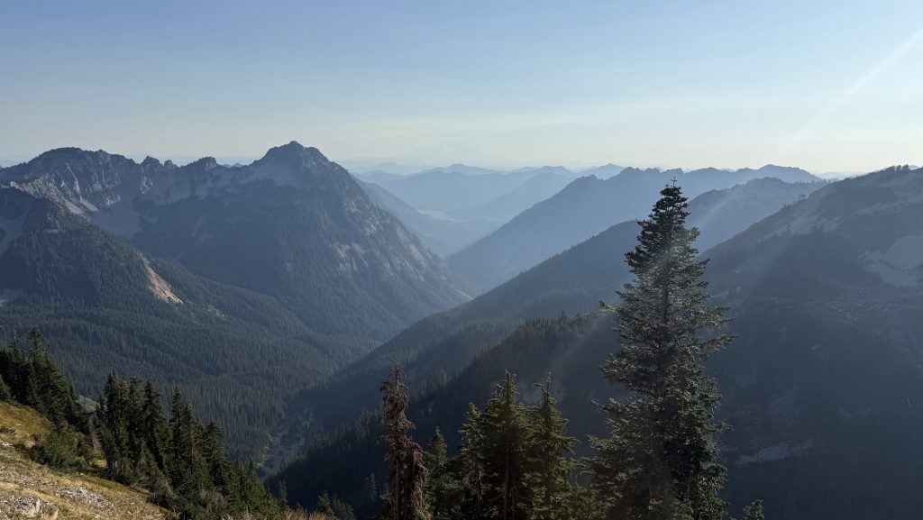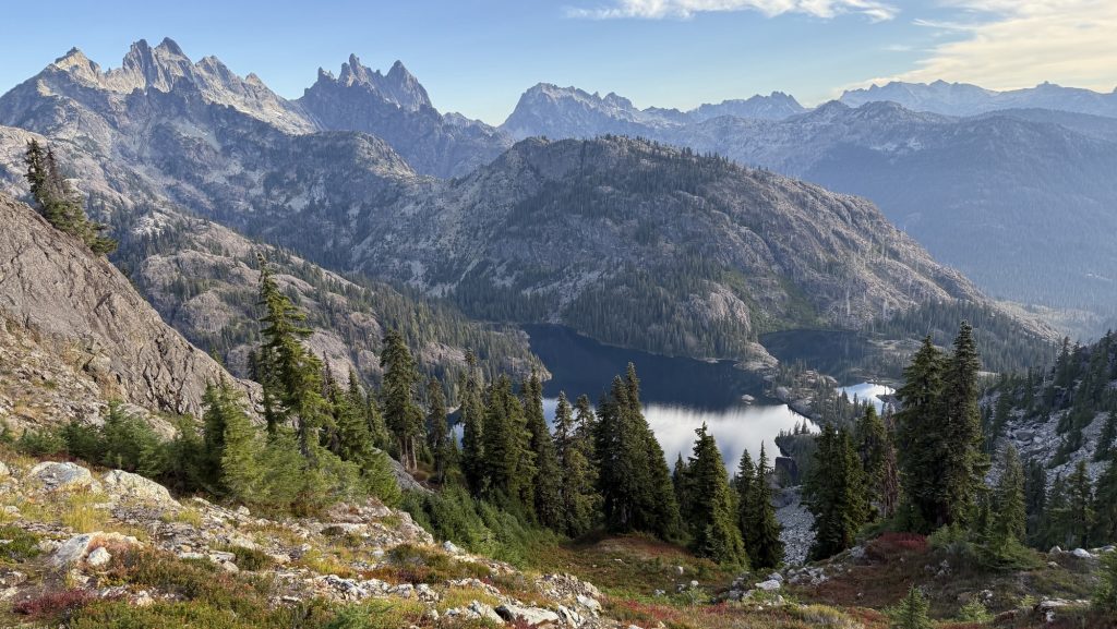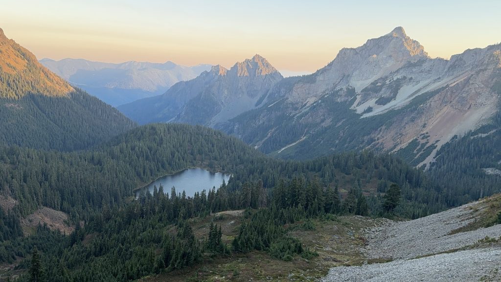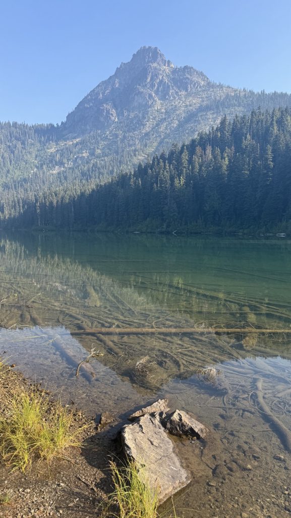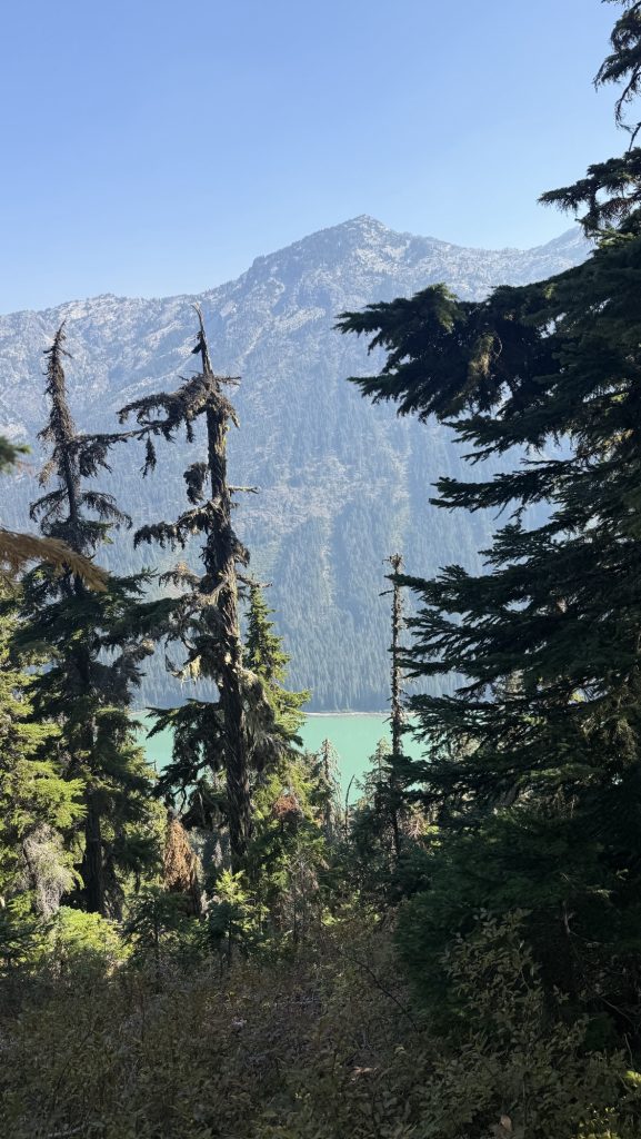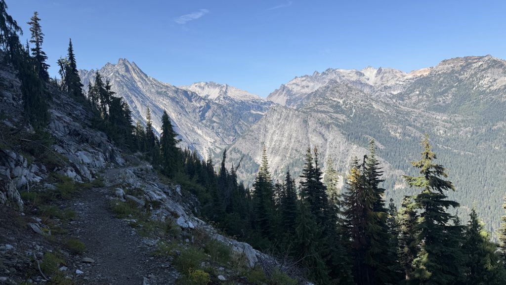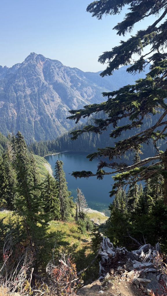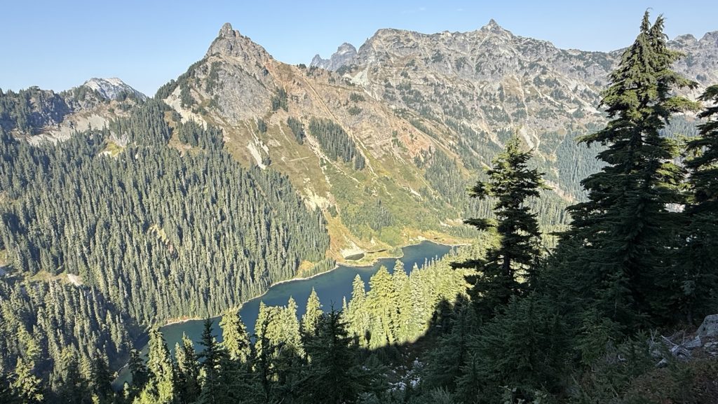 We had a gorgeous day: sunshine, beautiful glacier views, Spectacle lake, many more lakes, one huge lake, Waptus lake from high above in the afternoon and then hiked around it on the other side, climbs and descents. My feet hurt but it was great. We started listening to the book “Chaos” about the Manson murders. Wild! Very interesting.