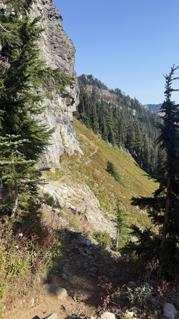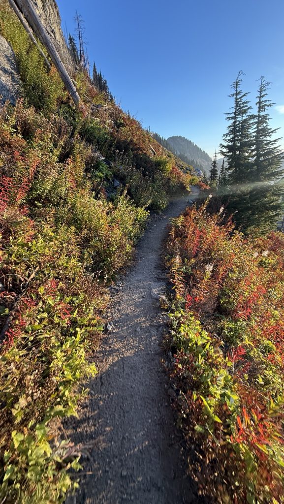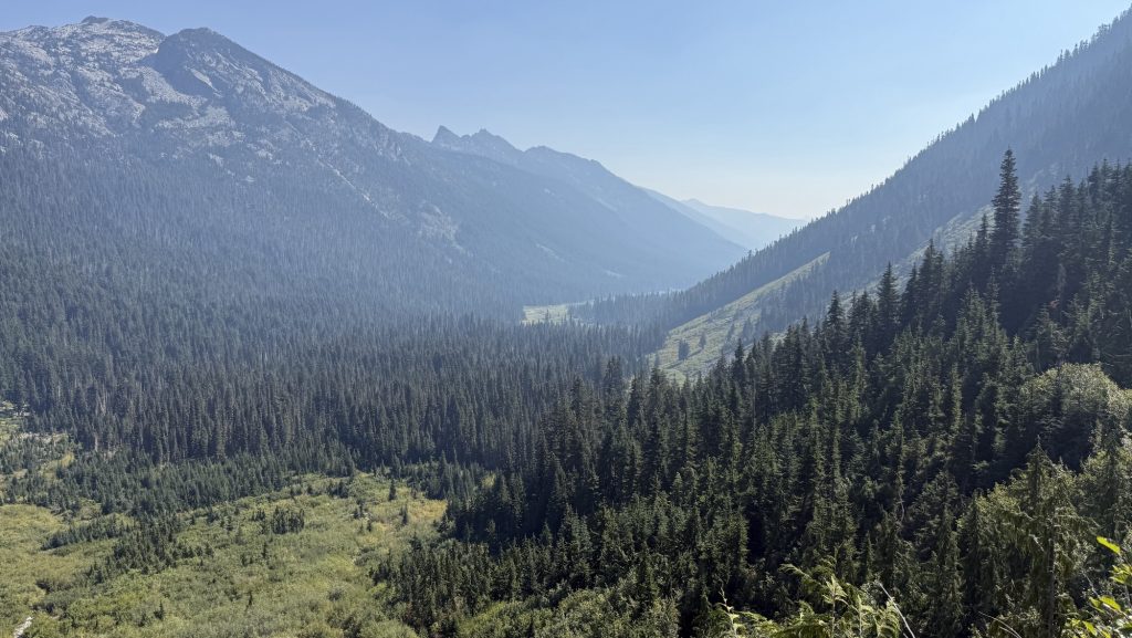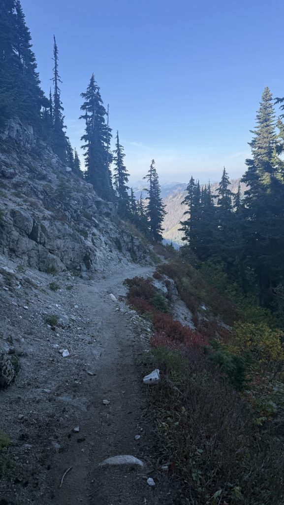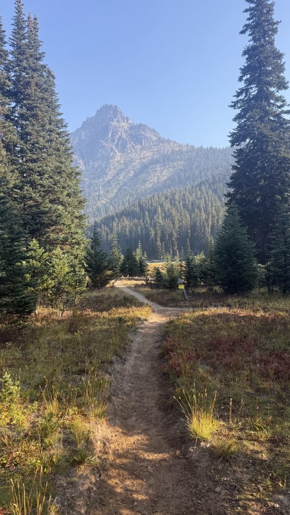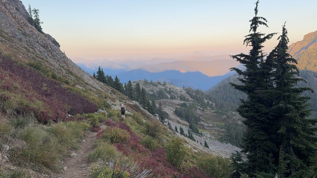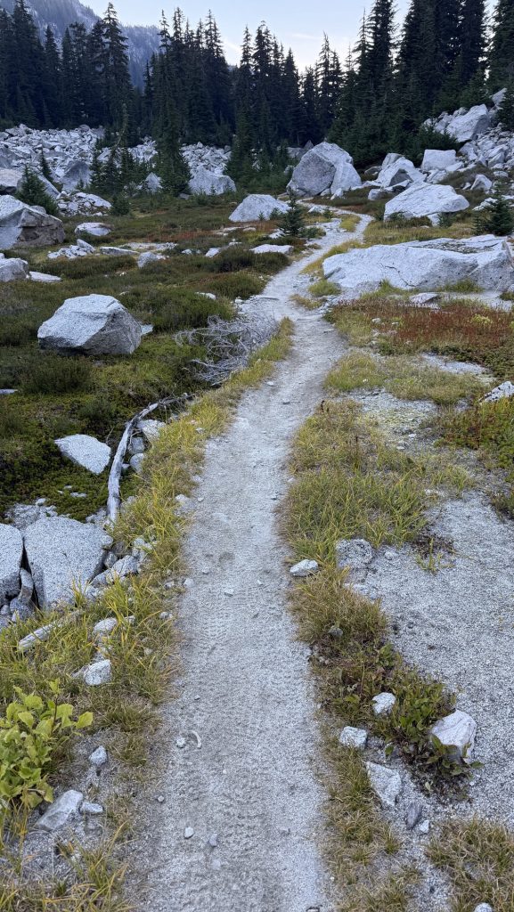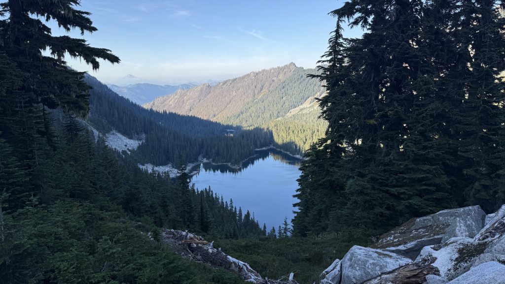 We had a gorgeous day: sunshine, beautiful glacier views, Spectacle lake, many more lakes, one huge lake, Waptus lake from high above in the afternoon and then hiked around it on the other side, climbs and descents. My feet hurt but it was great. We started listening to the book “Chaos” about the Manson murders. Wild! Very interesting.