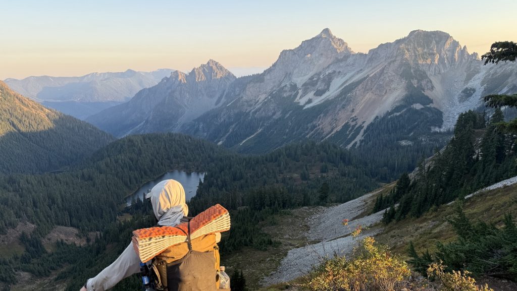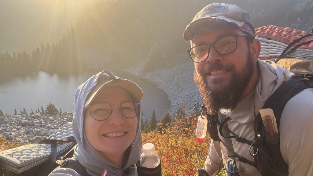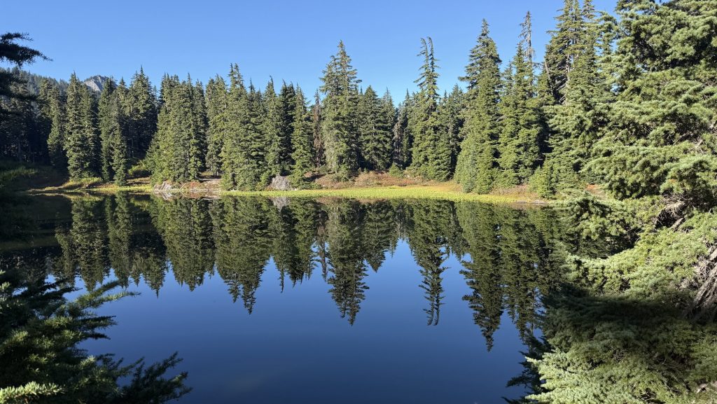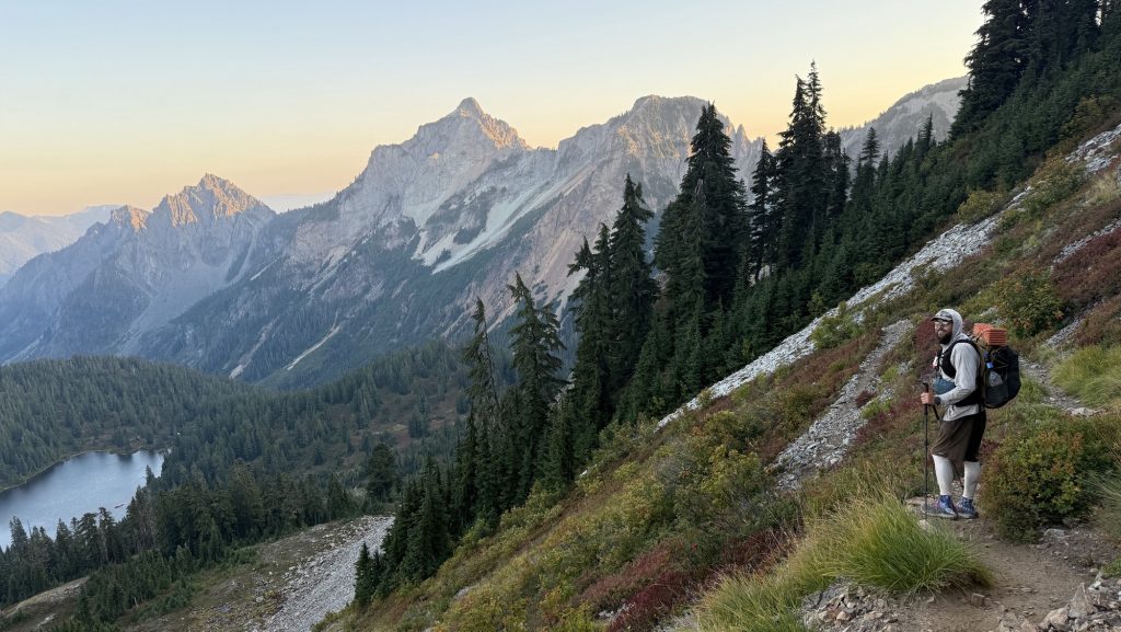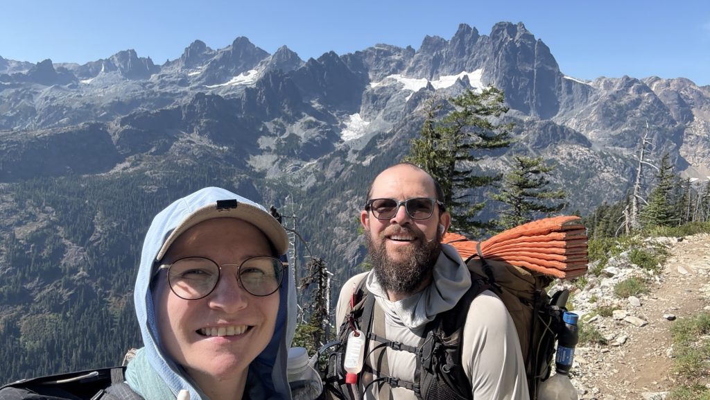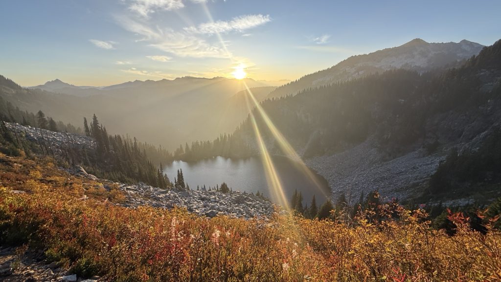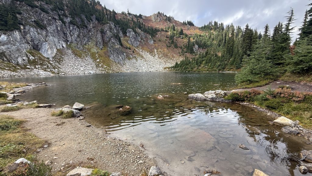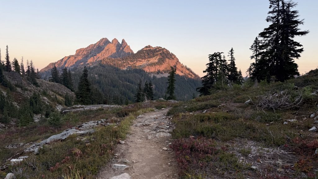 We had a gorgeous day: sunshine, beautiful glacier views, Spectacle lake, many more lakes, one huge lake, Waptus lake from high above in the afternoon and then hiked around it on the other side, climbs and descents. My feet hurt but it was great. We started listening to the book “Chaos” about the Manson murders. Wild! Very interesting.