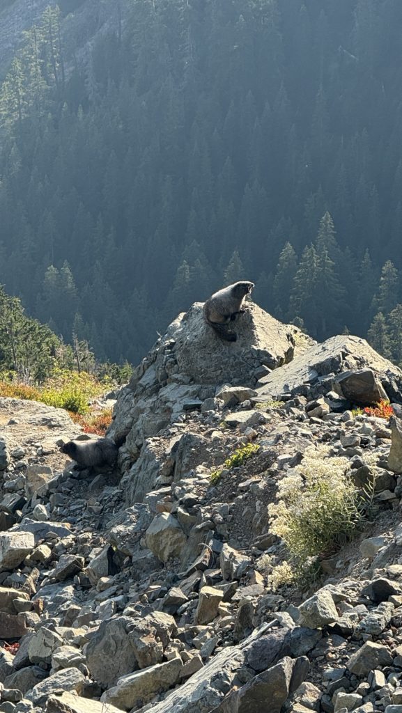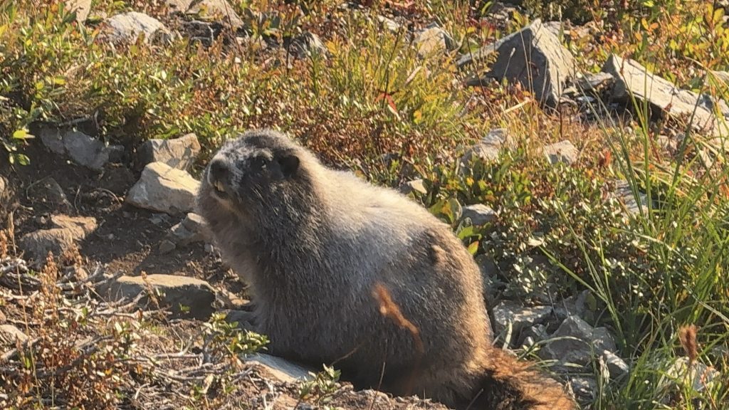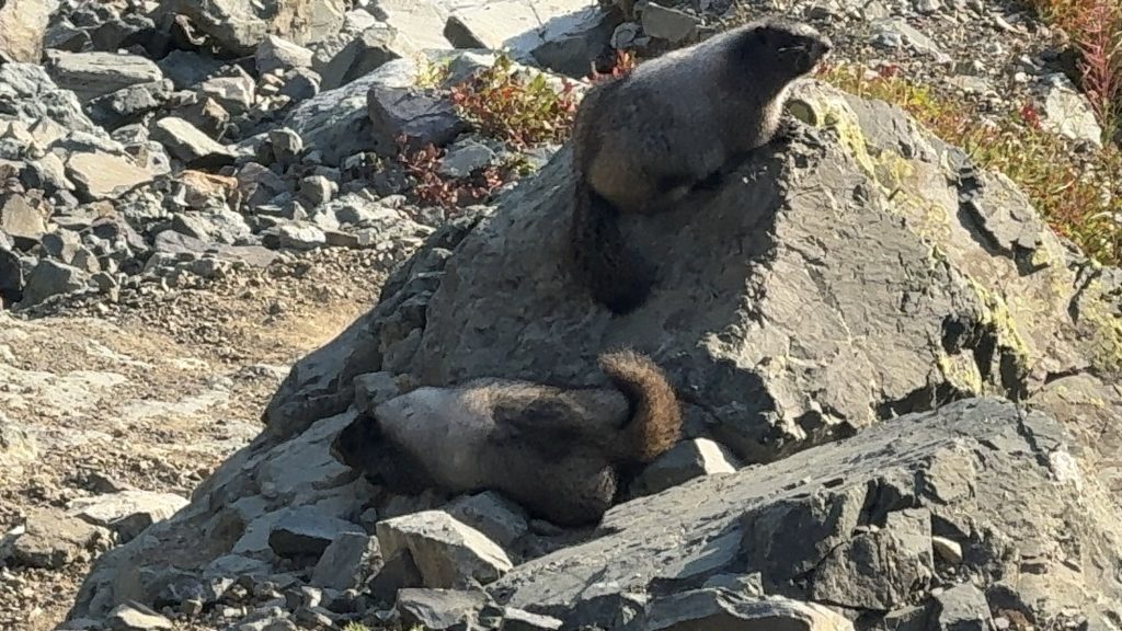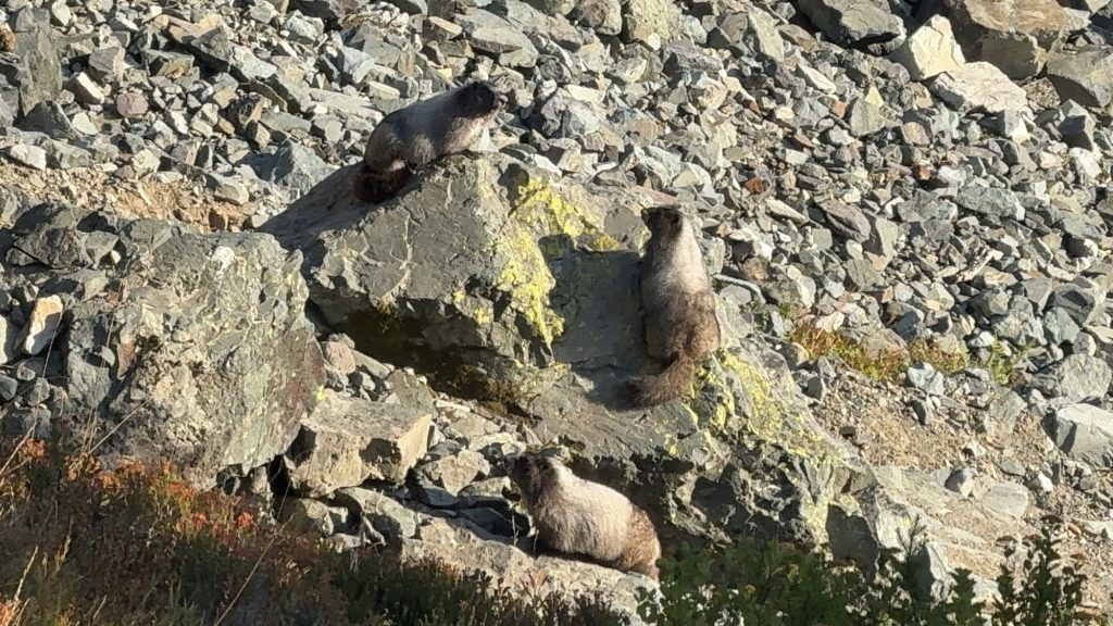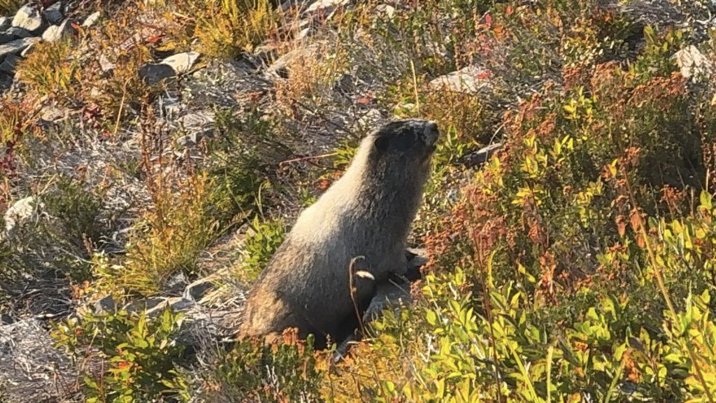 We enjoyed the sun and the views and later in the afternoon we saw marmots again – we haven’t seen those since the Sierra and they were really really cute and quite big – the size of cats. They conversed with each other over long distances with really high shrieks. They weren’t afraid of us as they’ve probably seen thousand of hikers walk by their „house“. I think they’re getting fat for hibernation – perfect as there were millions of huckleberries everywhere.