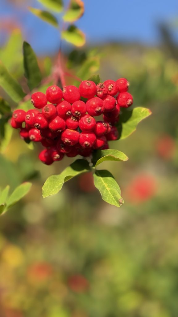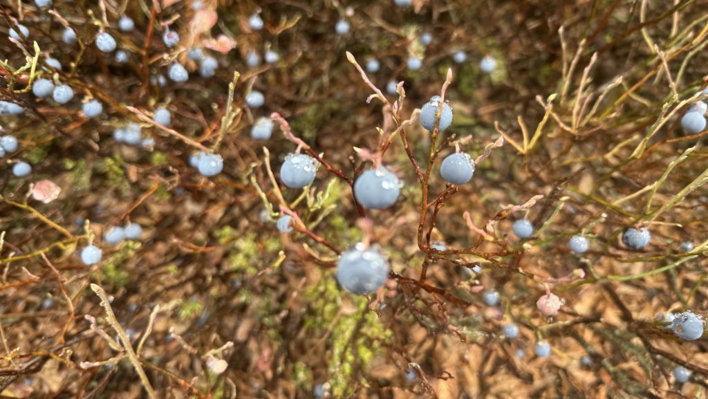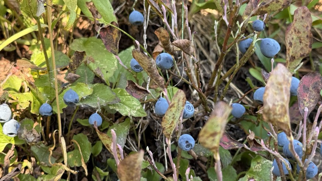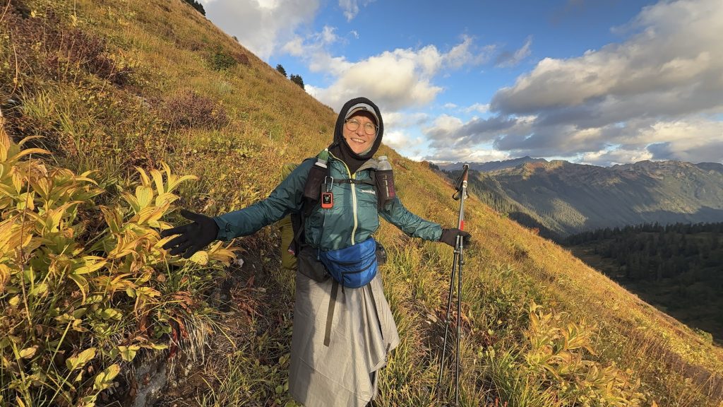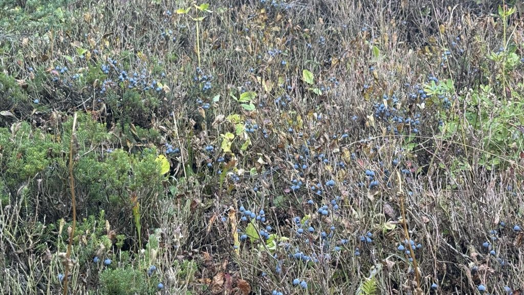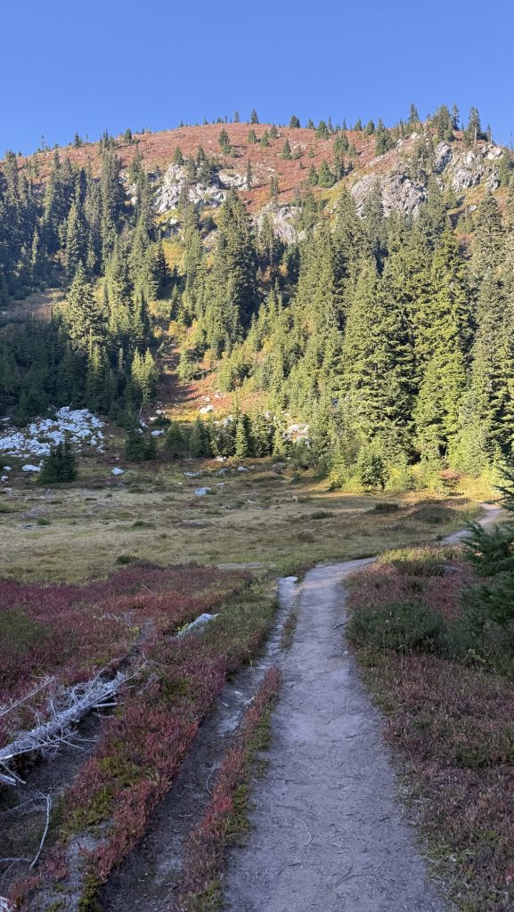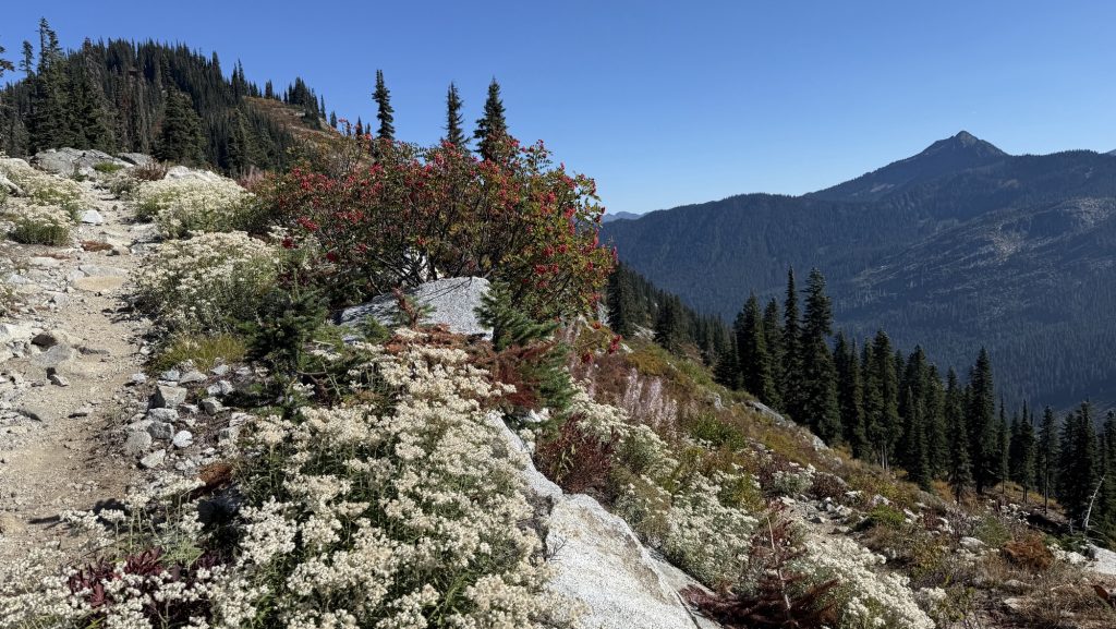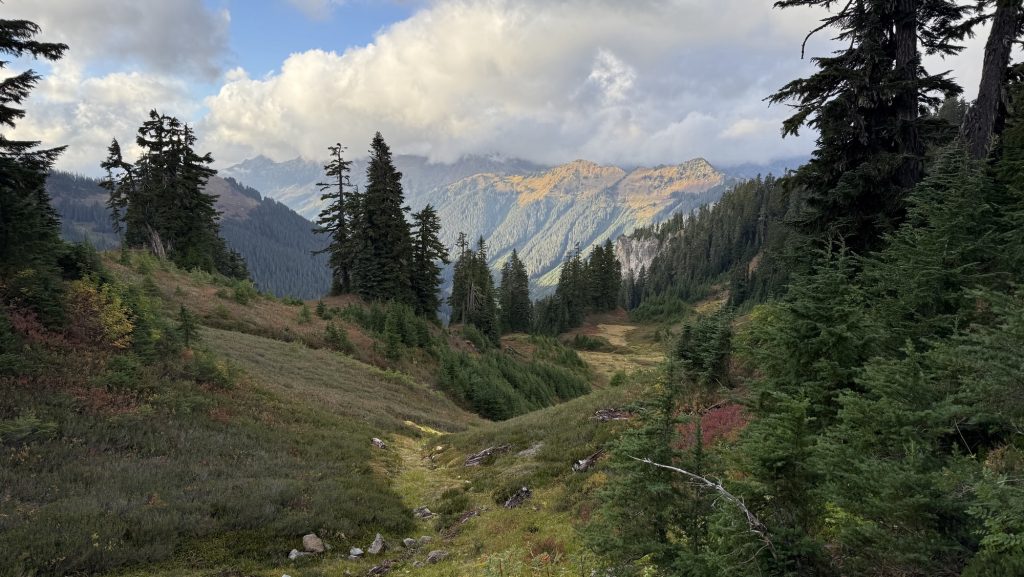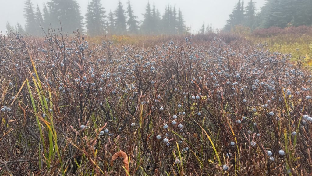 It stopped raining and the next climb warmed us up. The clouds lifted a bit and we could finally see the beautiful landscape with an abundance of red huckleberry bushes and some yellow bushes, rugged mountains and soft rolling green pine covered valleys.