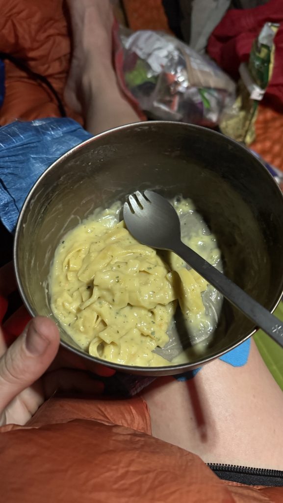 It’s been a beautiful morning with nice views. I had service on top of a hill to call my mom. Good news from home, so I feel good. But generally just feel strong today, because we had 1.5 dinners last night. I think I haven’t been eating enough calories so we gotta change that.