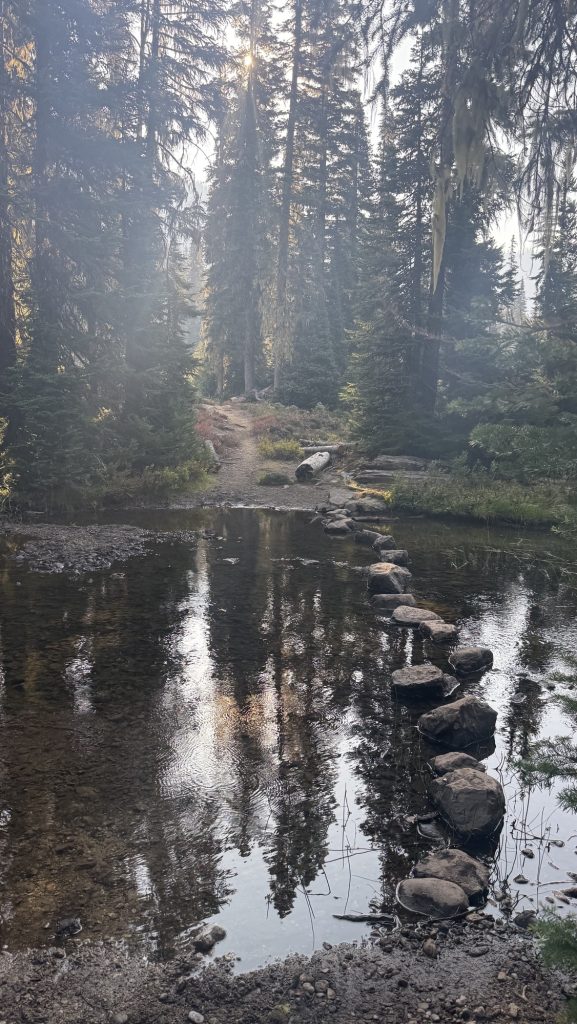 The scenery has changed alot since entering Oregon: it’s always green! It’s beautiful. We mostly hike through the forest now and get occasional views of blue lakes and volcanos.