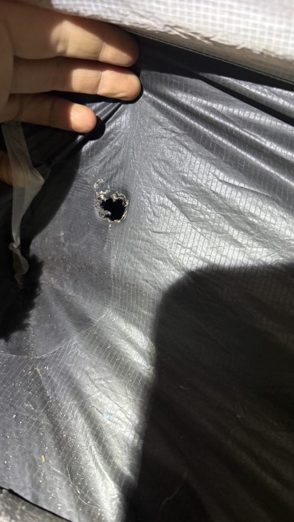 We noticed to our shock that a mouse had chewed through our tent and my odor proof food bag to eat our granola breakfast. Because we camped next to a river, neither of us heard it.