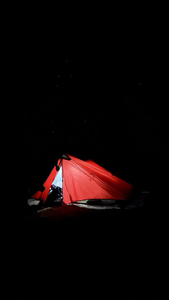 The stars were clear and bright, the wind howling and rattling on our tent, we finally in dry clothes and our warm sleeping bags, slurping hot ramen soup with bear creek, passing out at 9pm. Another day done. Good. Not many left. Scary.