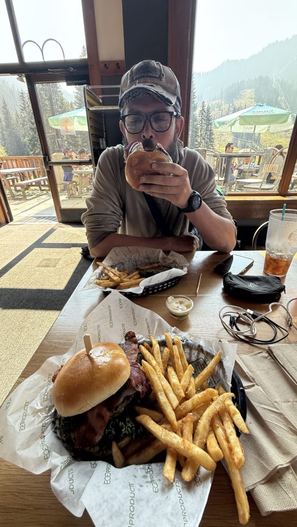 We got to Steven’s Pass shortly after noon and were delighted the restaurant serving burgers that according to Google was closed, was indeed open. We ordered two cheese burgers and Pepsi, hooked up our electronics to charge and got the resupply box we had sent ourselves.