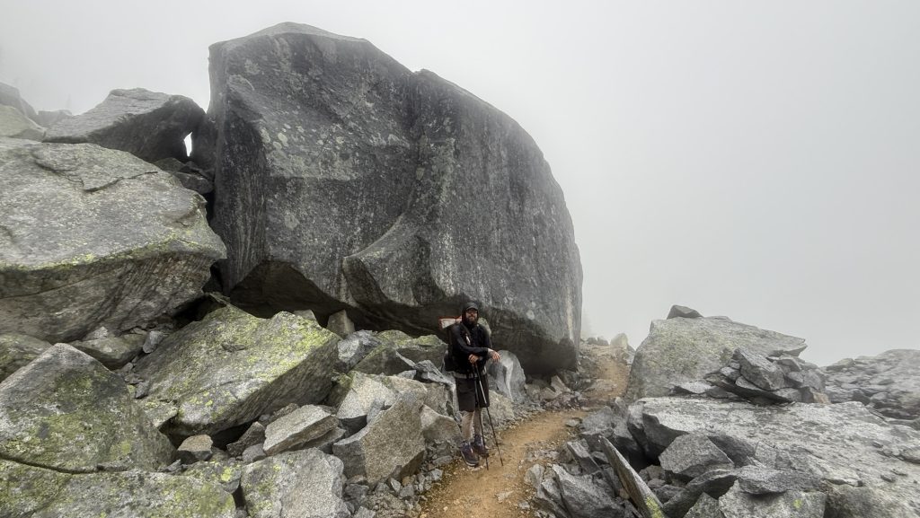 It was still raining when lunch time came but luckily we found space to sit between some boulders and threw Ice’s tarp over the top, fixing it with some rocks. We were still cold with our puffies so we kept hiking soon.